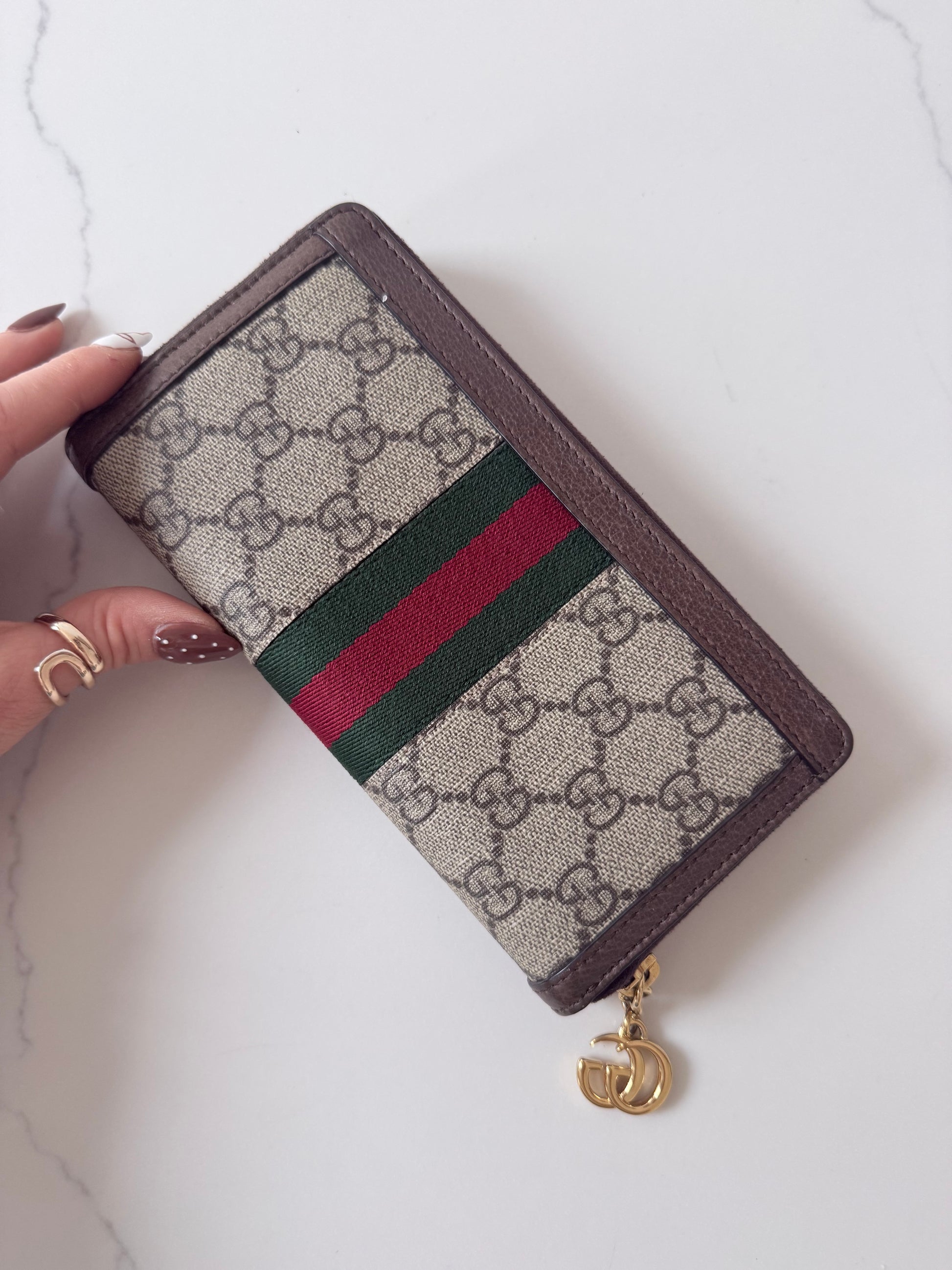Gucci Ophidia zip around wallet in excellent used condition. No heavy signs of wear or damage. interior and exterior are clean. Hardware is shiny. Wallet includes dustbag, box and authenticity. Est Retail: $740 plus tax.