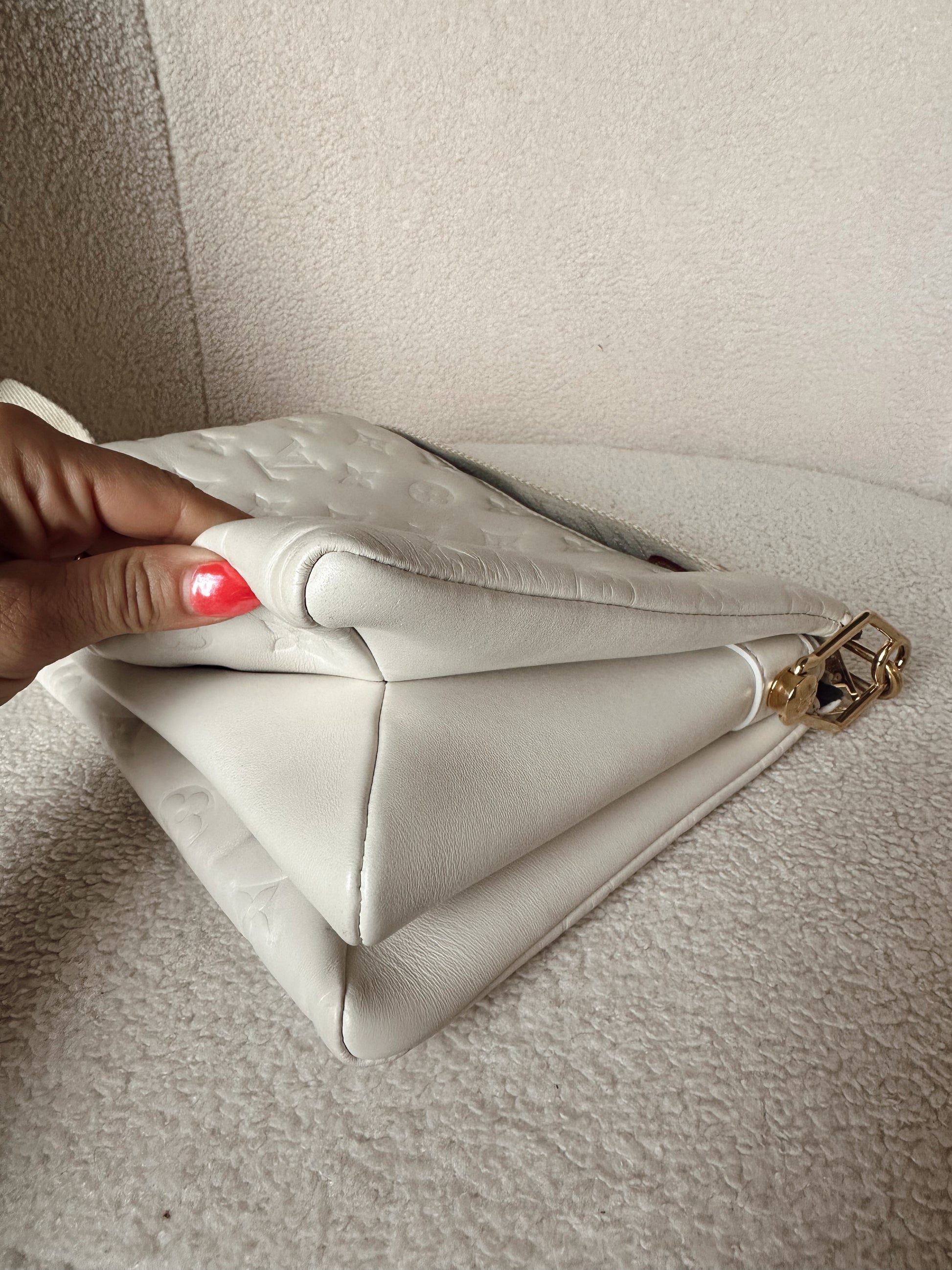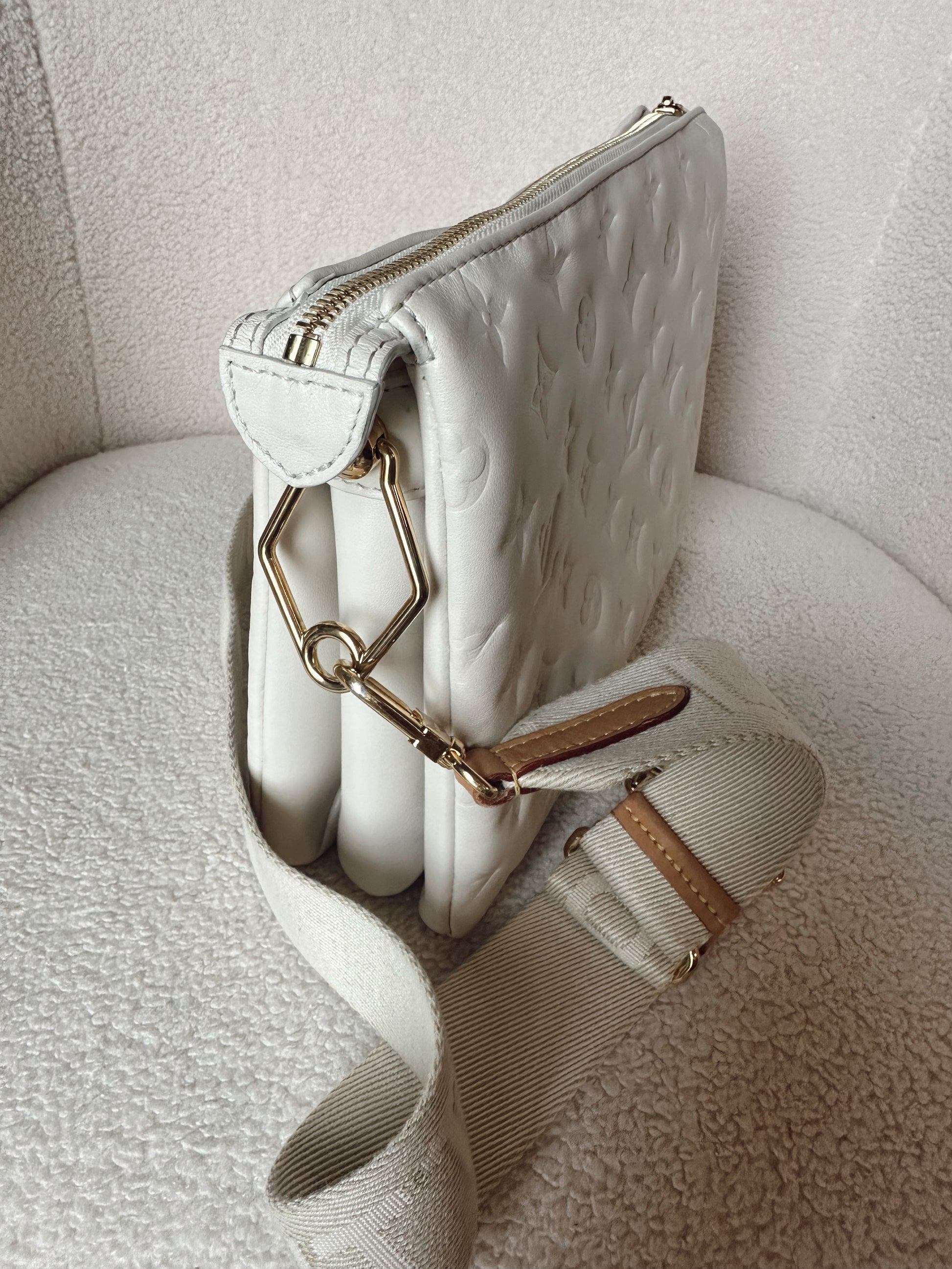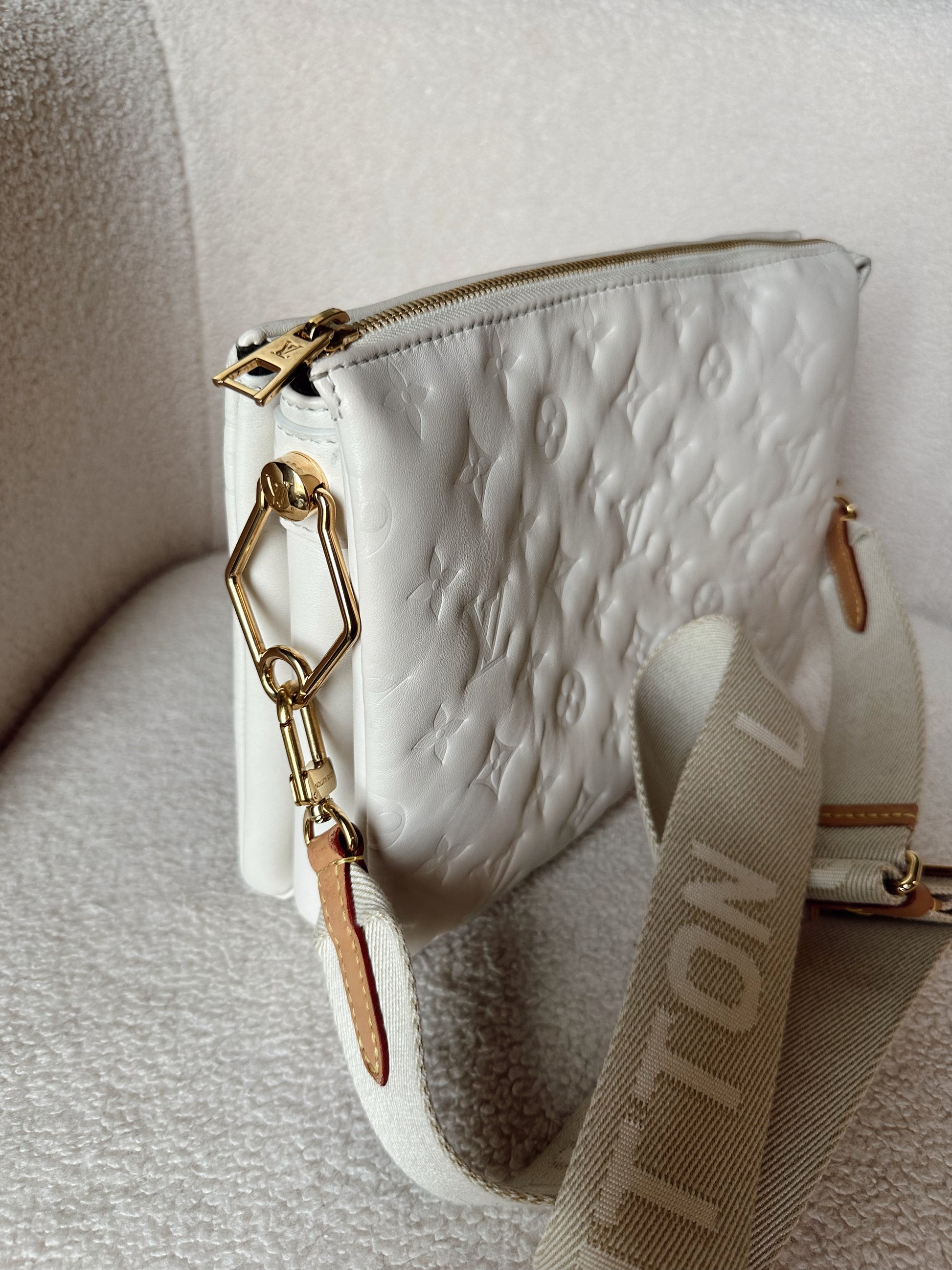 Louis Vuitton gently used Coussin PM in cream. Minimal signs of wear, clean interior & exterior. Minor wear to hardware, some smudges on leather (see images, not heavy) corners gently worn, zipper in great condition. Gold chain not included. Thick strap is in great condition also.