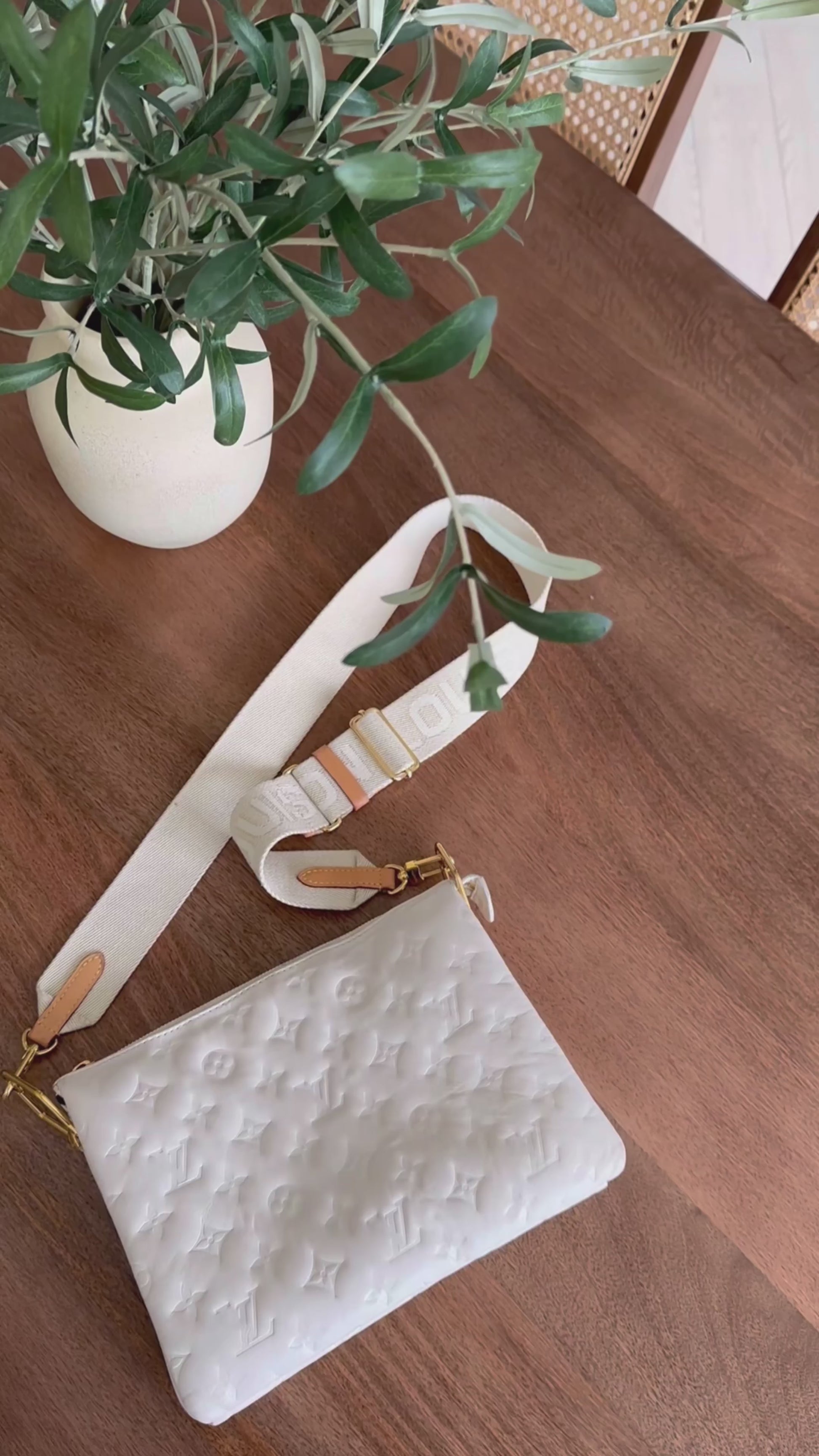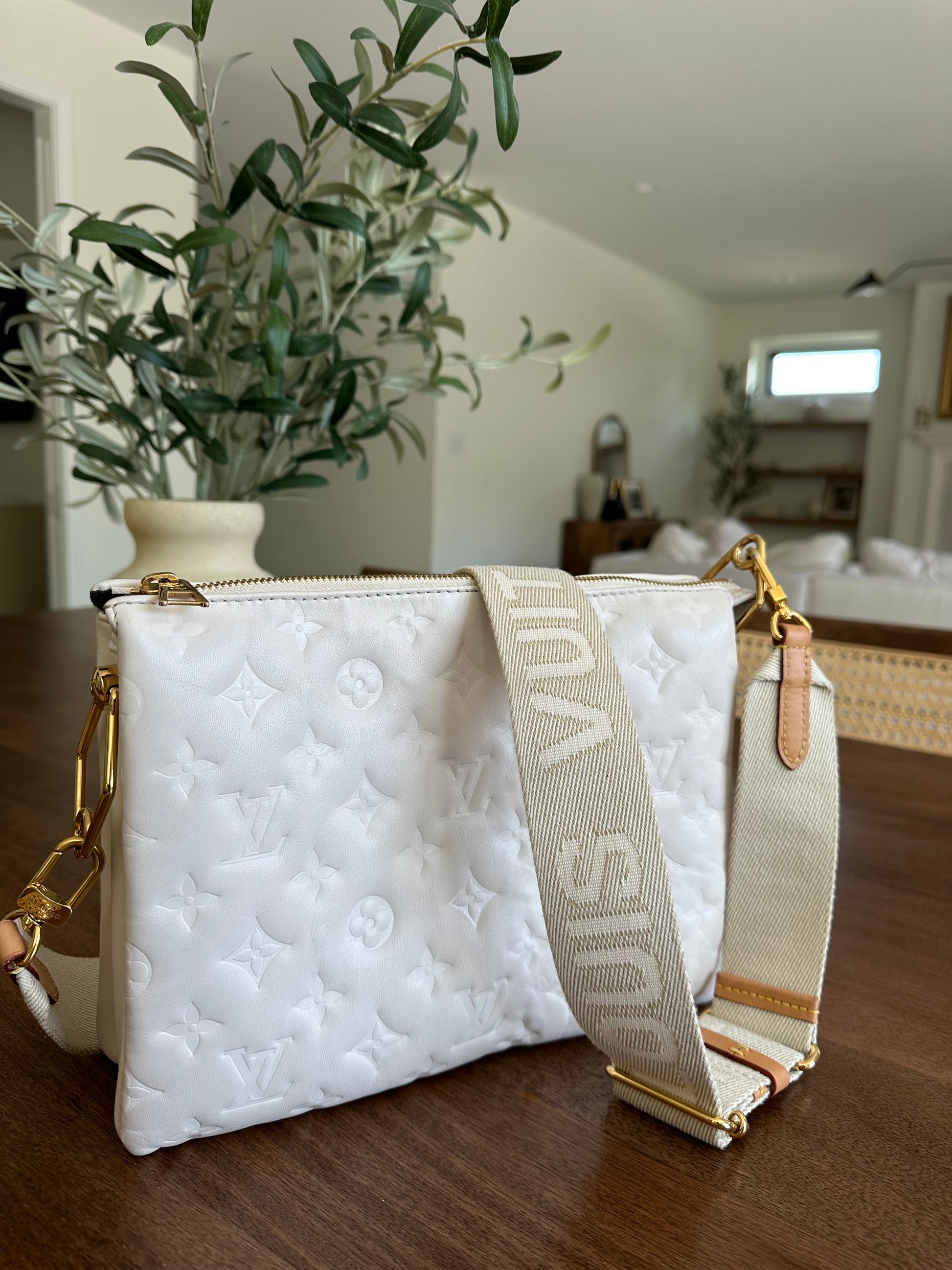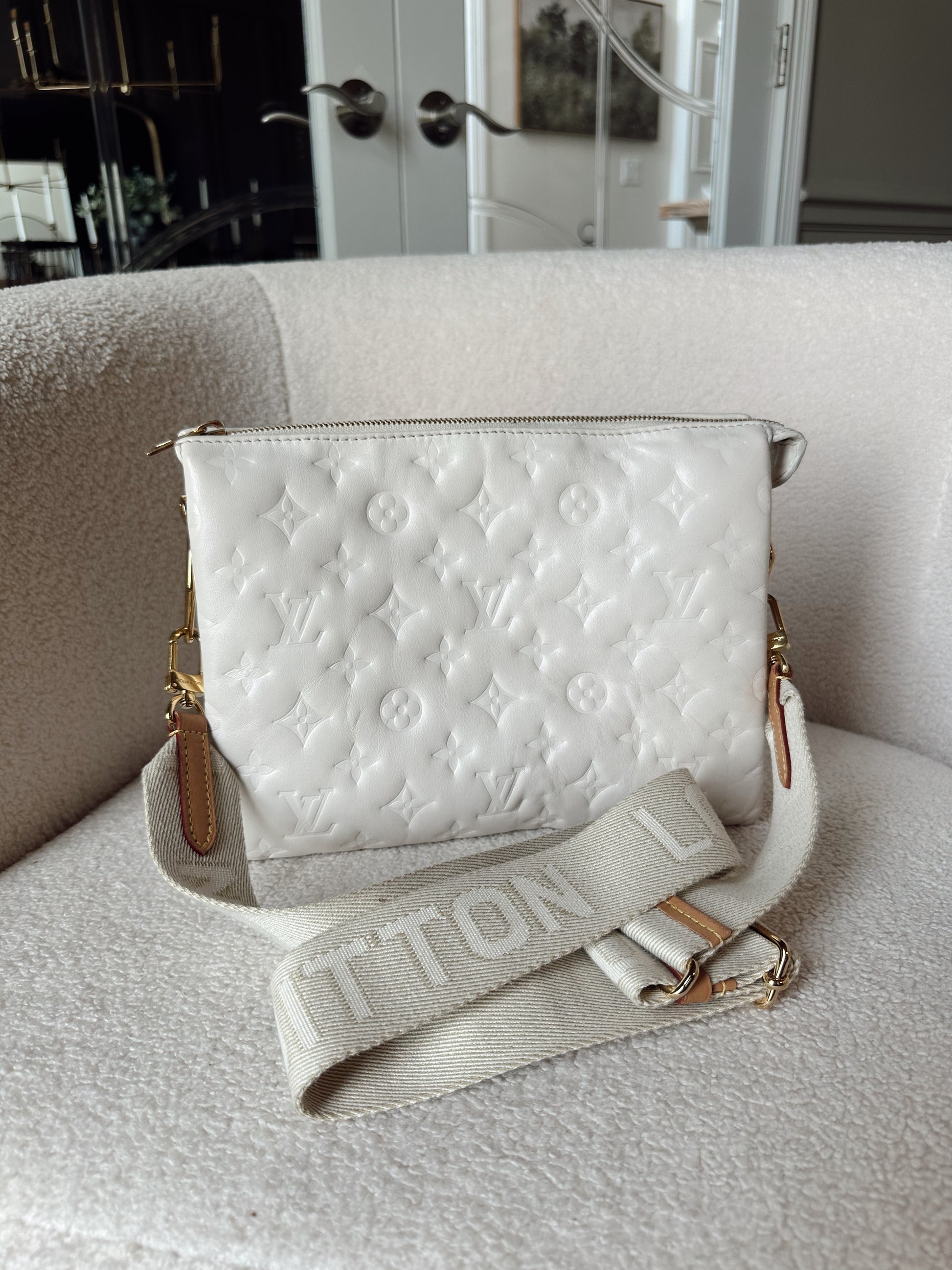 Louis Vuitton gently used Coussin PM in cream. Minimal signs of wear, clean interior & exterior. Minor wear to hardware, some smudges on leather (see images, not heavy) corners gently worn, zipper in great condition. Gold chain not included. Thick strap is in great condition also.