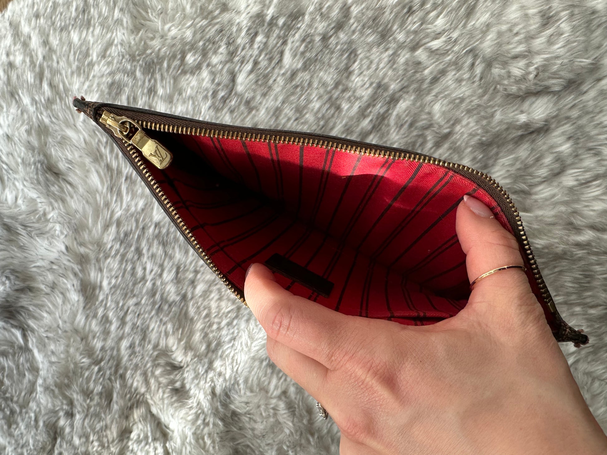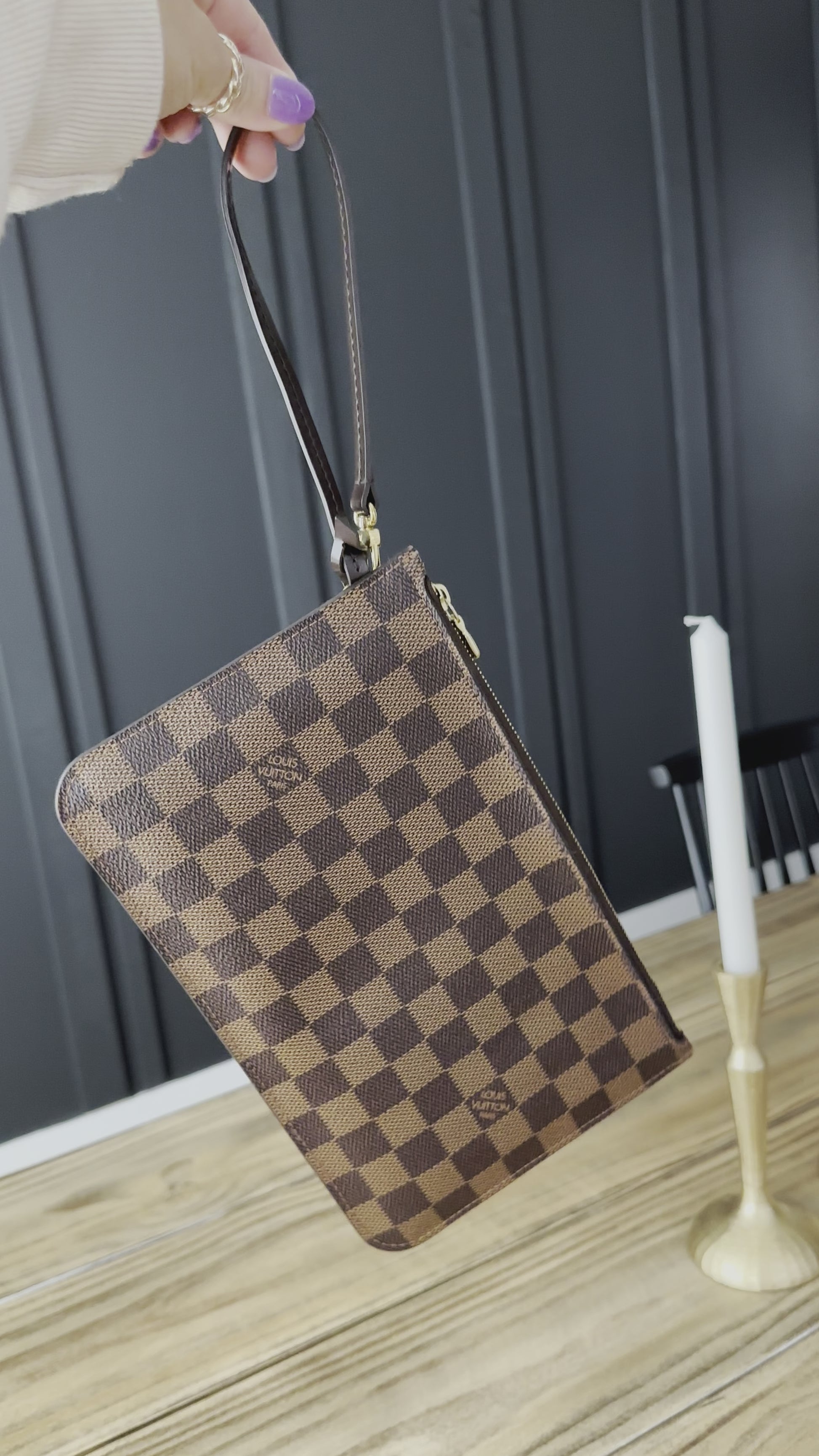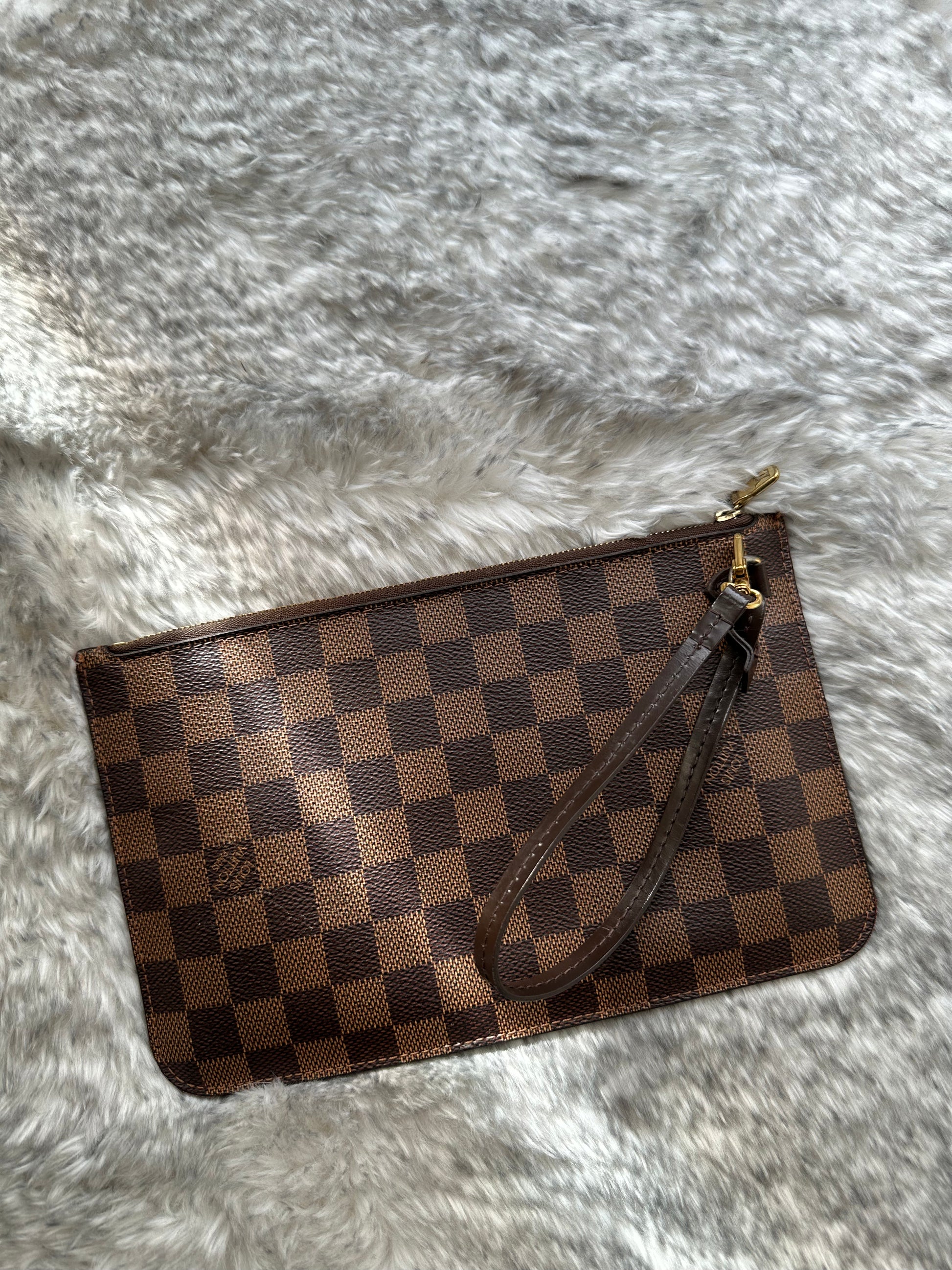 Louis Vuitton Neverfull Pouch/Wristlet. B condition, has some tarnishing, minor wear to bottom and edges. Clean leather inside & out. Overall good condition.