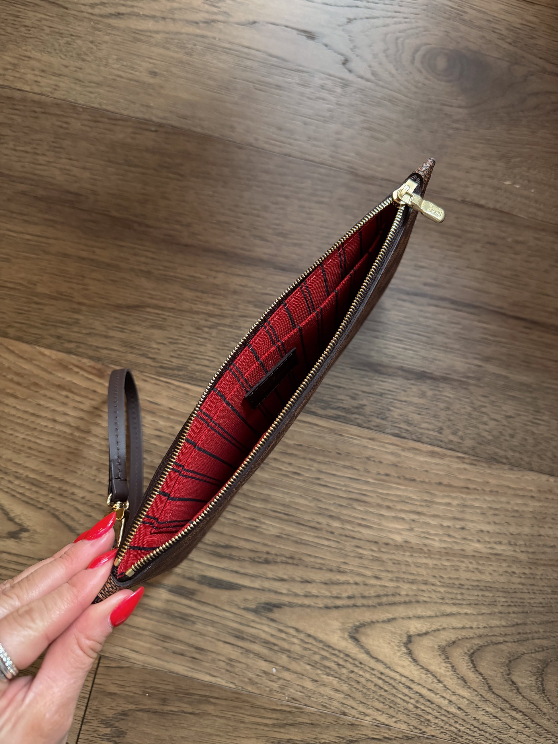 Louis Vuitton Neverfull wristlet in Damier Ebene. Clean interior and exterior. Hardware in great condition. See images for more details.