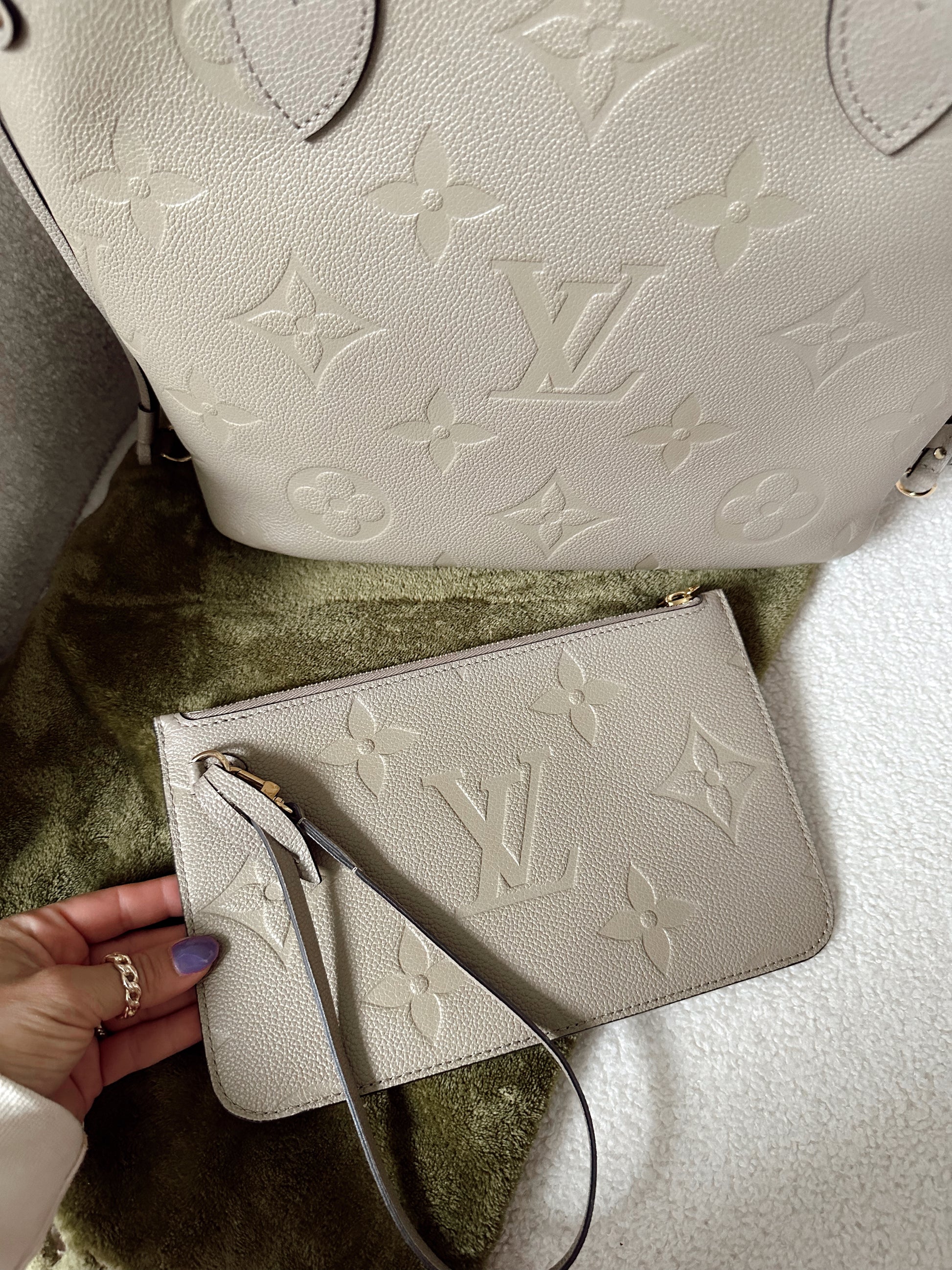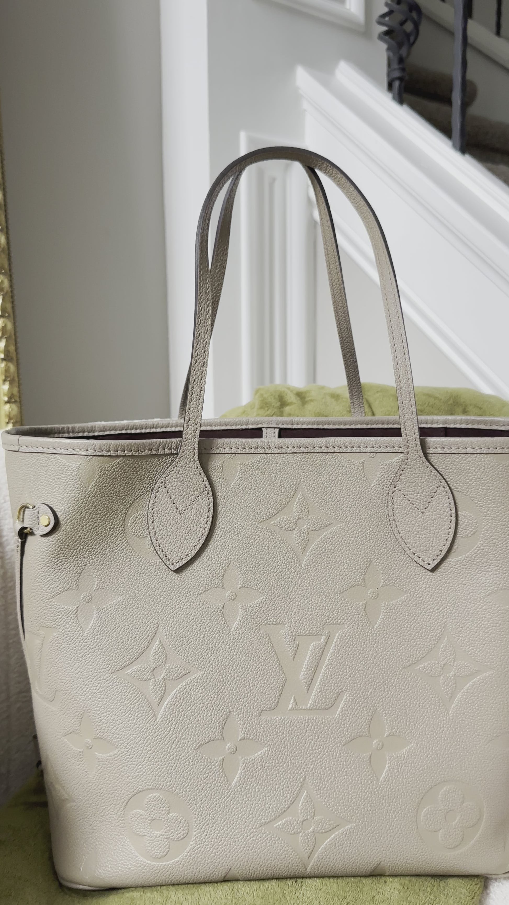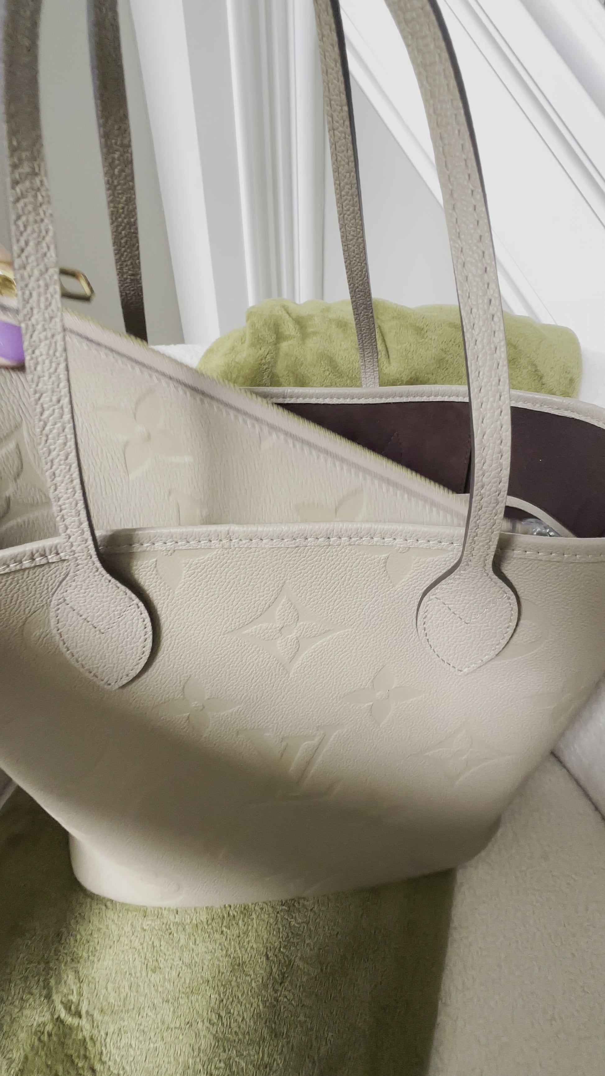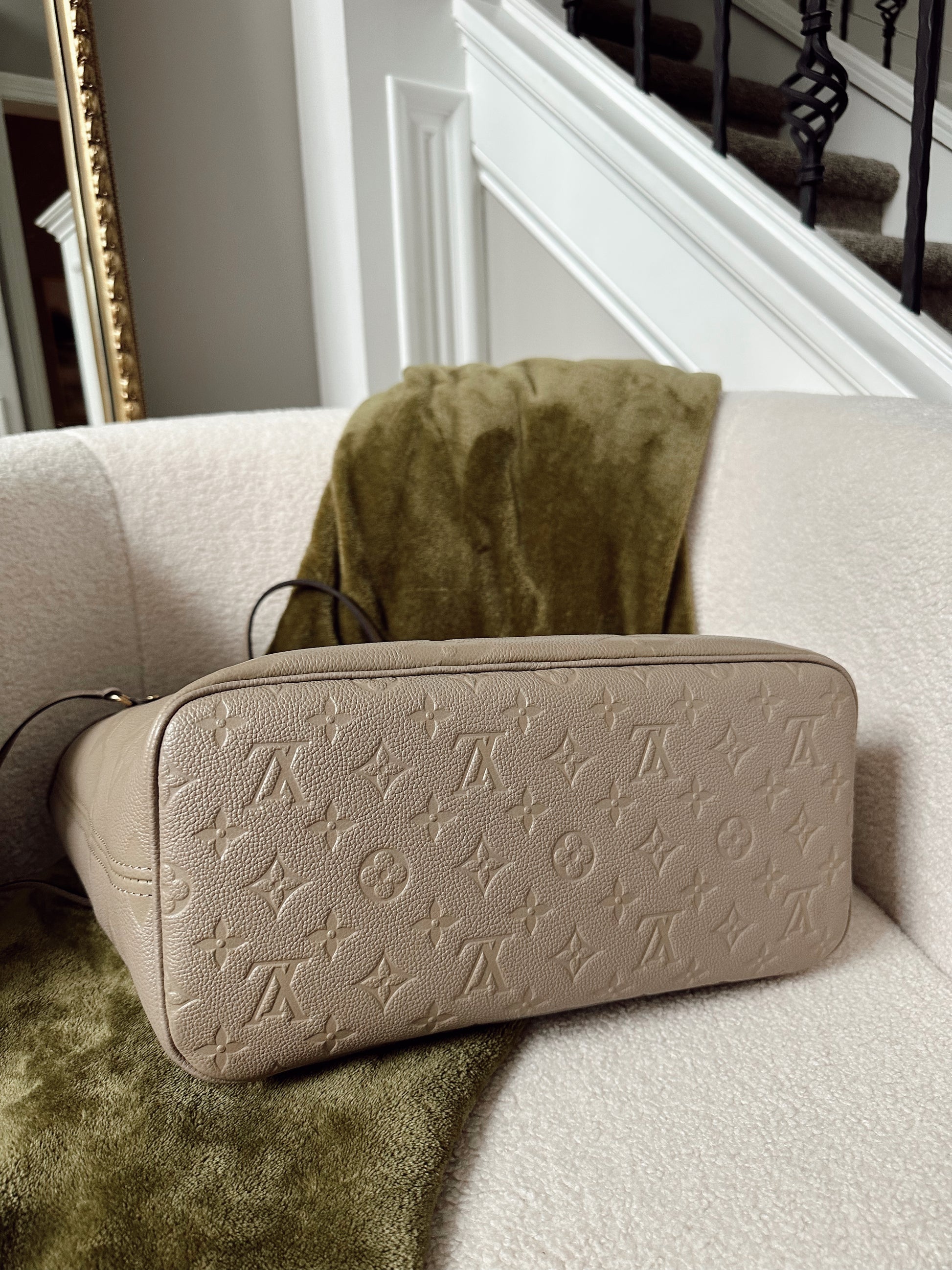 Louis Vuitton Tourterelle Monogram Giant Empreinte Neverfull MM. Used, No heavy signs of damage, includes pouch, dust box and dustbag. Clean interior and exterior. Excellent used condition.