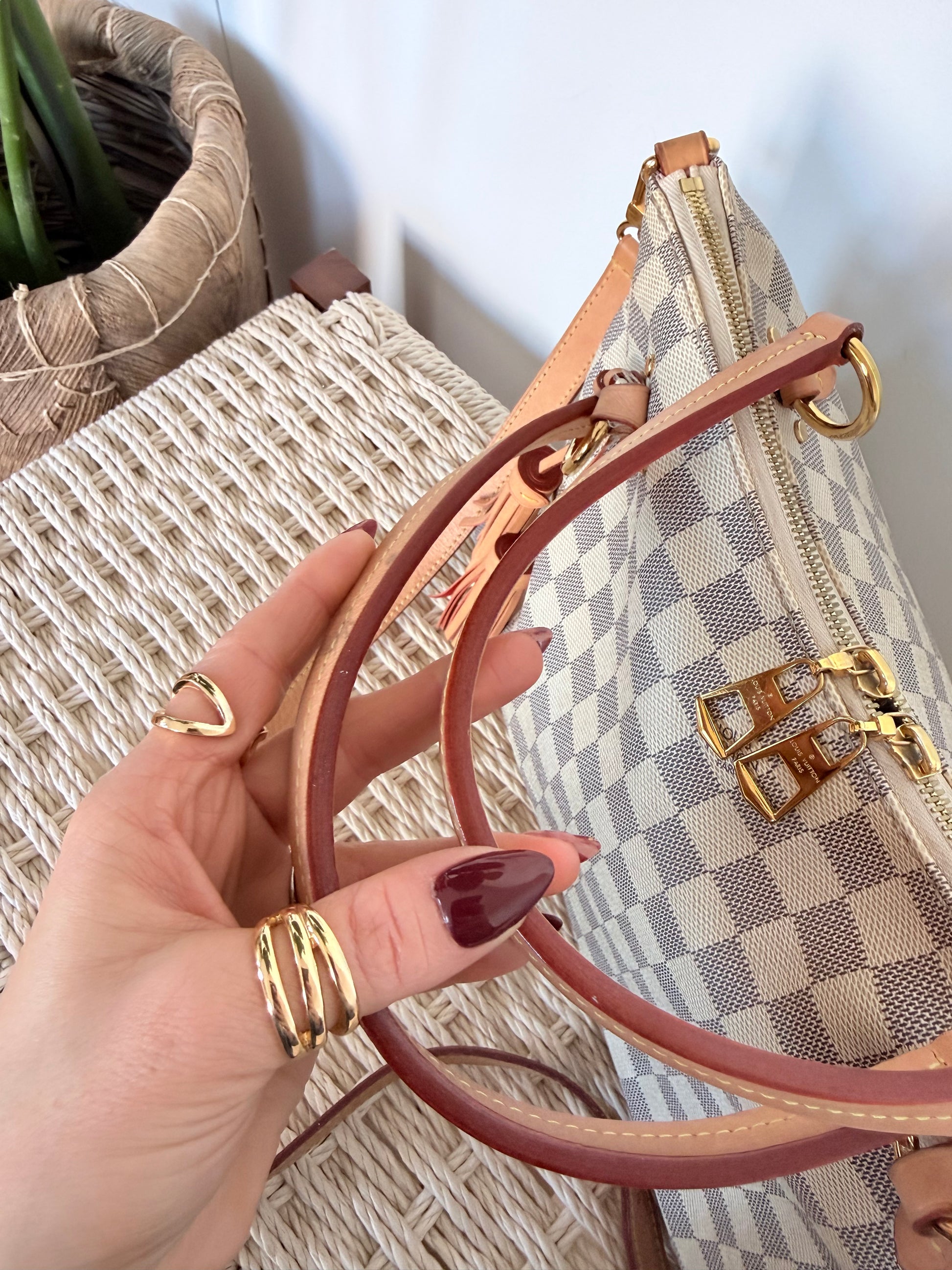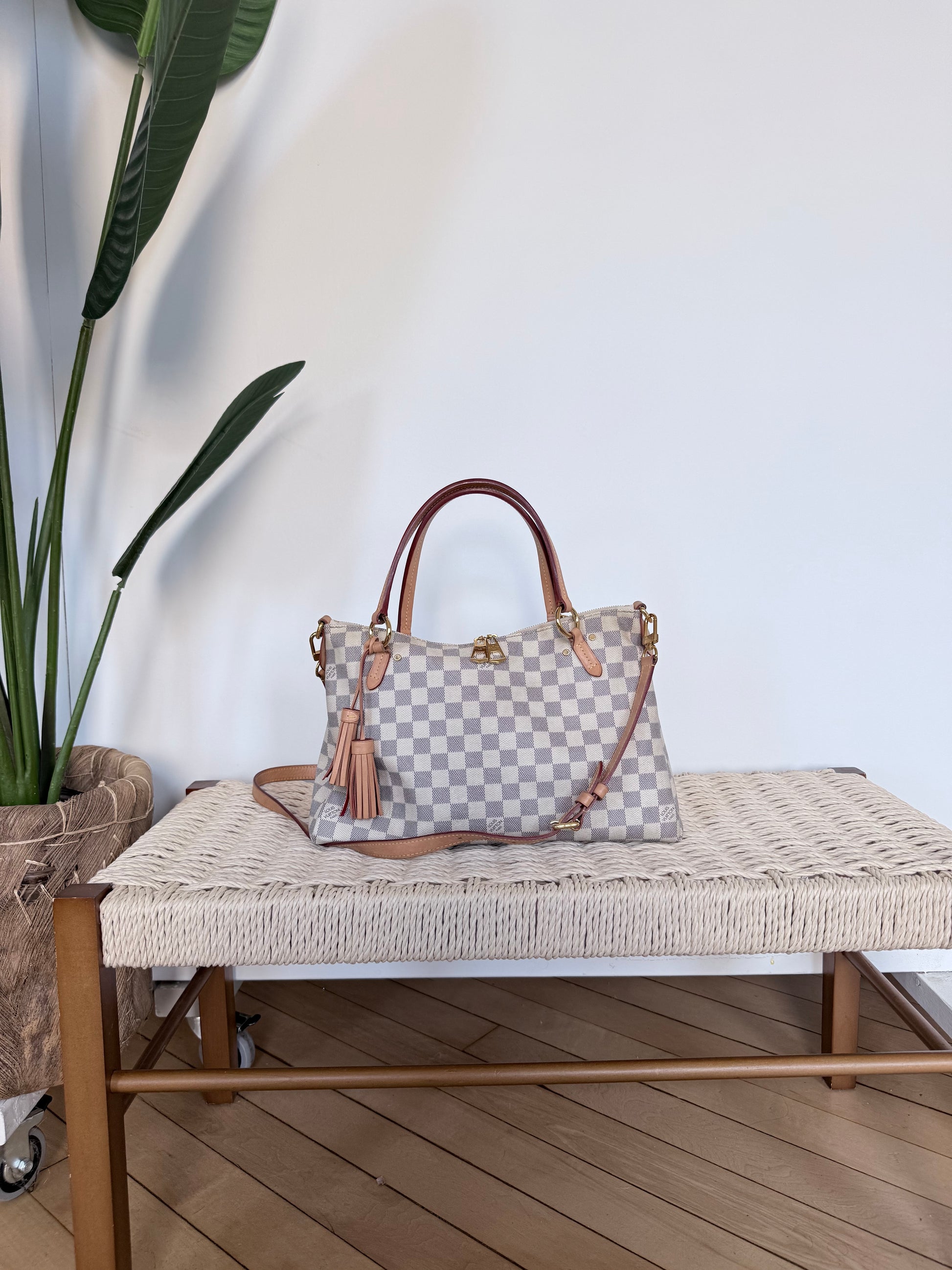 Louis Vuitton Lymington in Damier Azur Rose. Has some normal wear and tear on the outside, nothing heavy. A couple spots on the top handles (you can see in images). Crossbody handle gently used. *Pen marks on interior*