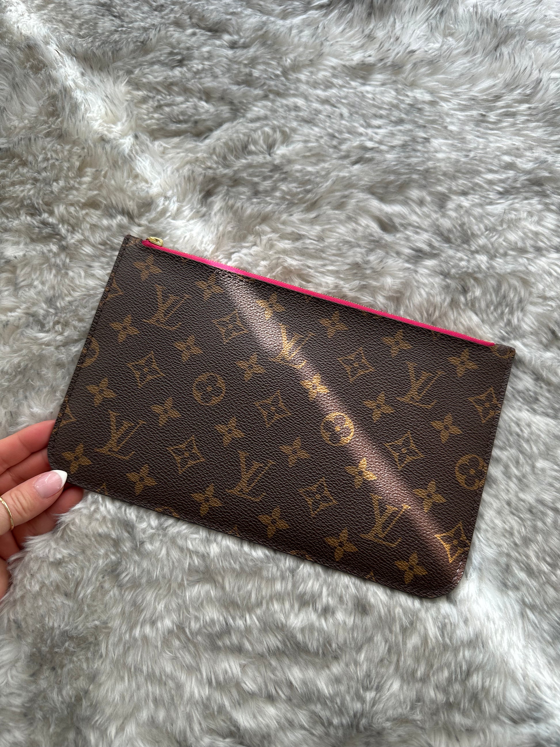 Louis Vuitton Neverfull Monogram Wristlet Pink Pivoine interior. Excellent used condition.