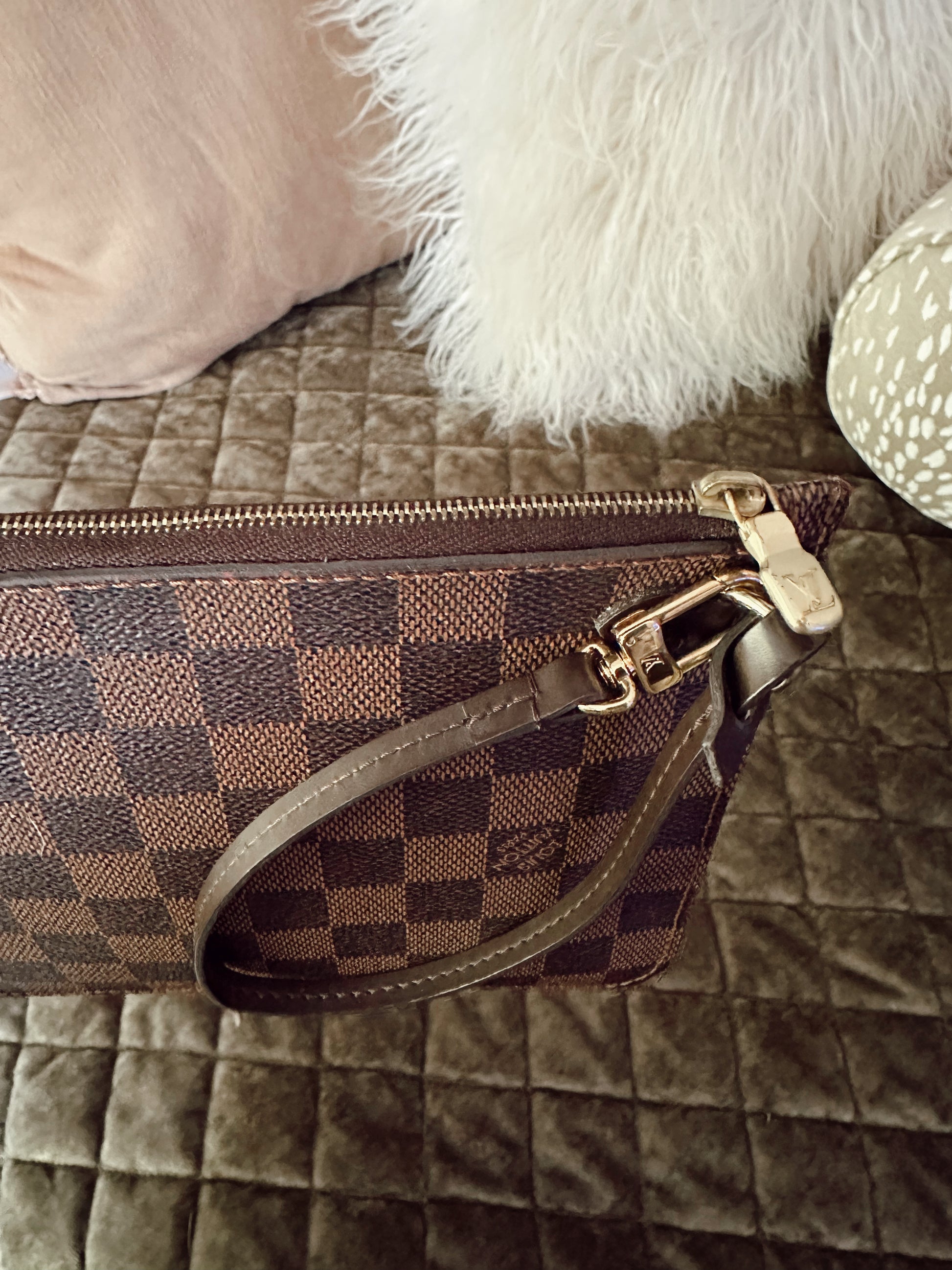 Louis Vuitton Neverfull Wristlet, Damier Ebene Cherry. Gently used condition, minor fabric fray by zipper, clean interior/exterior. No heavy signs of damage