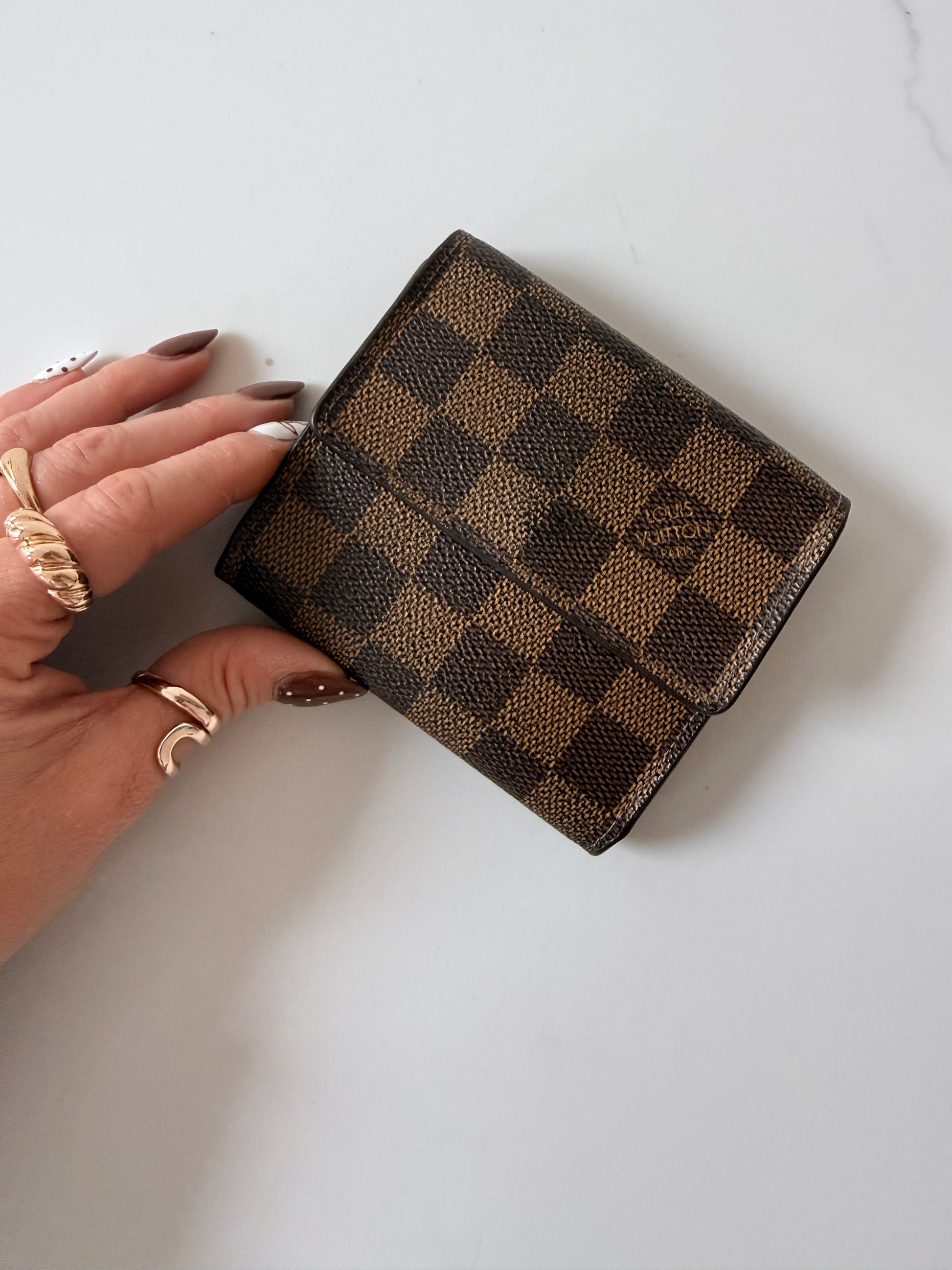Louis Vuitton trifold Elise wallet in damier ebene. Great used condition. The cutest little wallet for on the go , or for those smaller handbags. Minor tarnishing to hardware, corners show minor wear from normal use over time. Interior is clean. See images for more details. Est retail: $630 plus tax