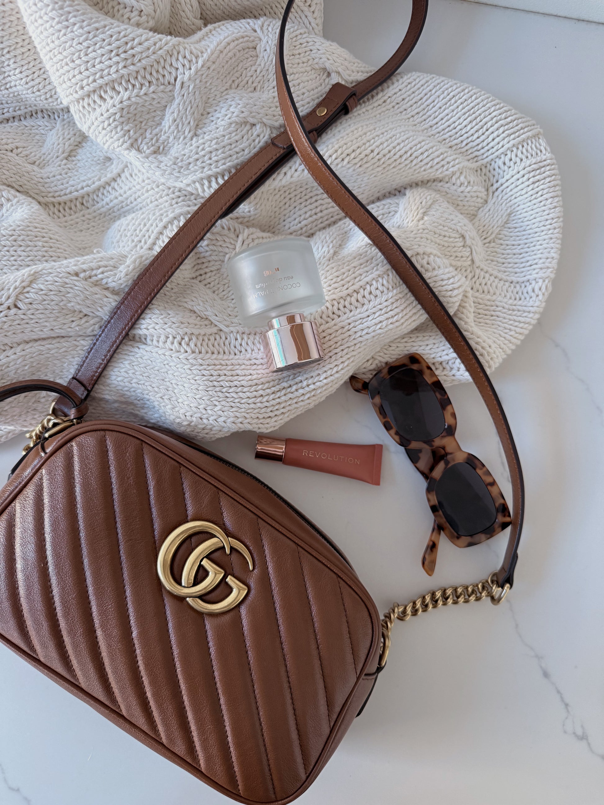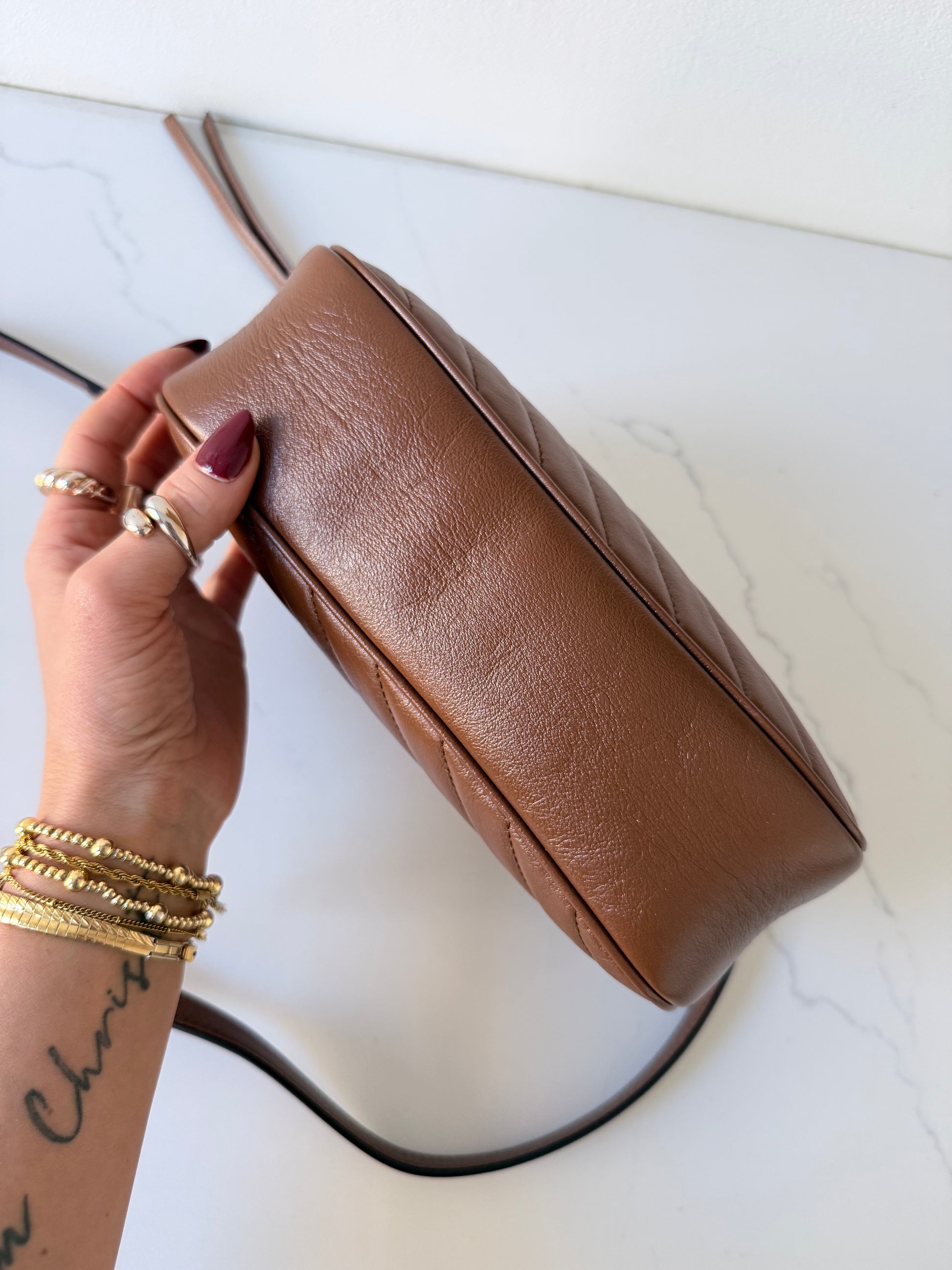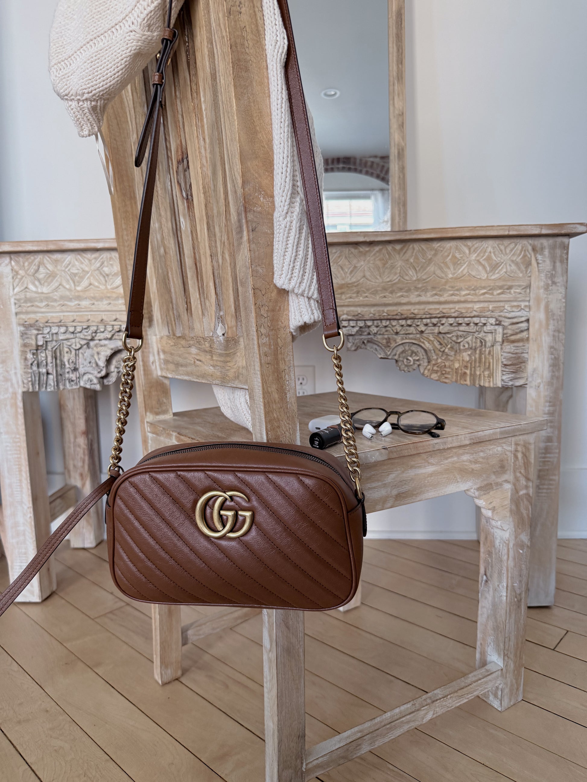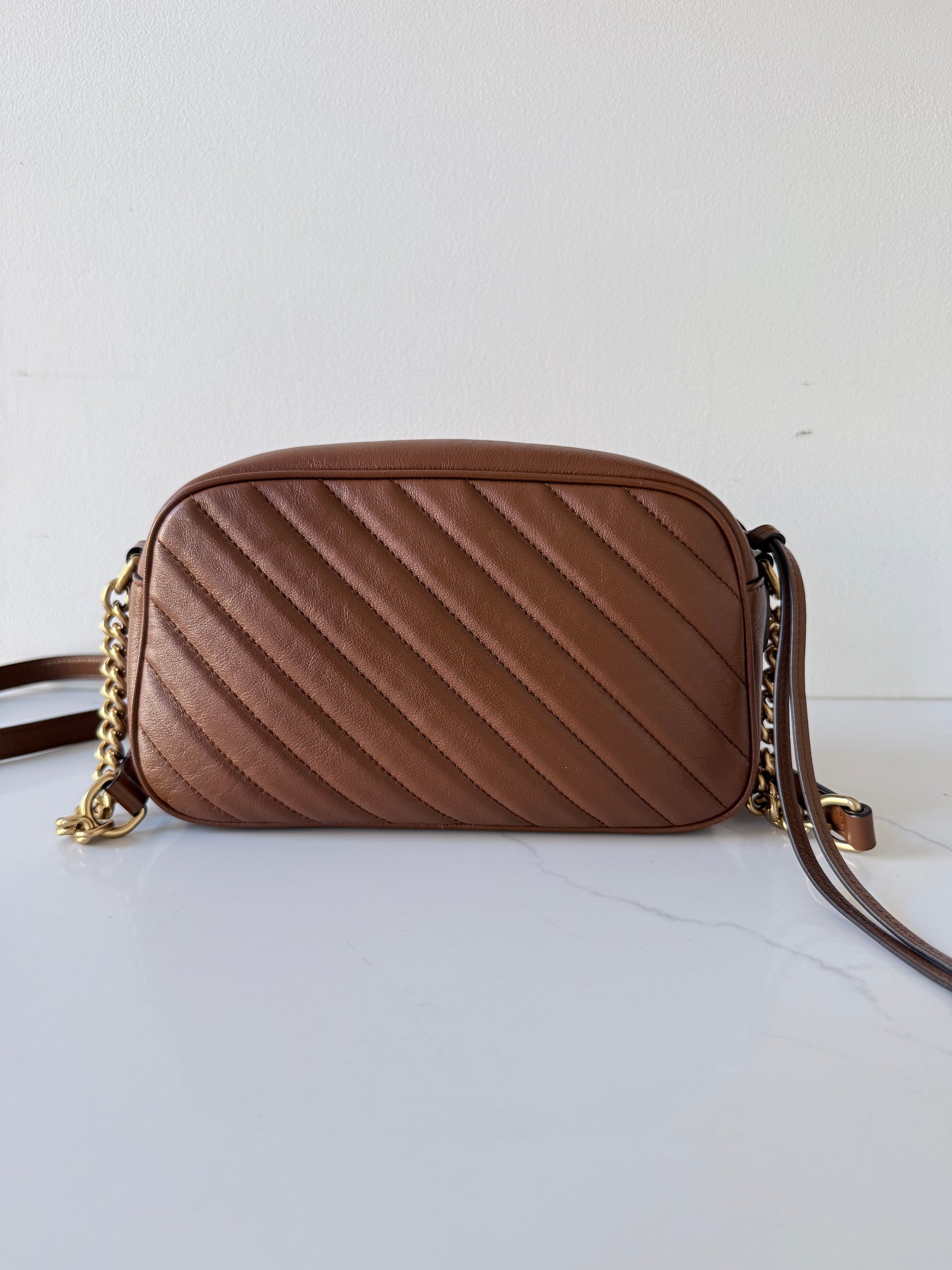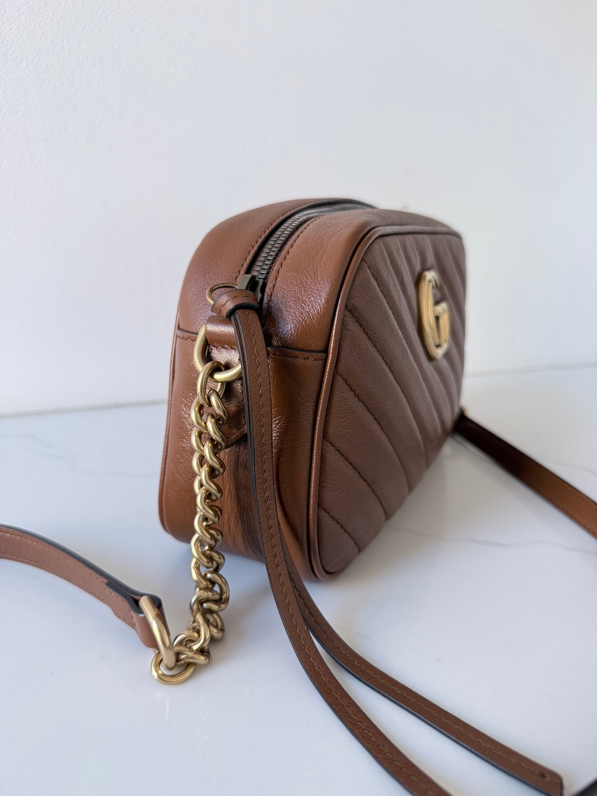 Gucci marmont glazed camera bag in brown leather with gold hardware. Excellent used condition, no signs of wear or damage. Clean interior and exterior. Gorgeous color, authenticity included.