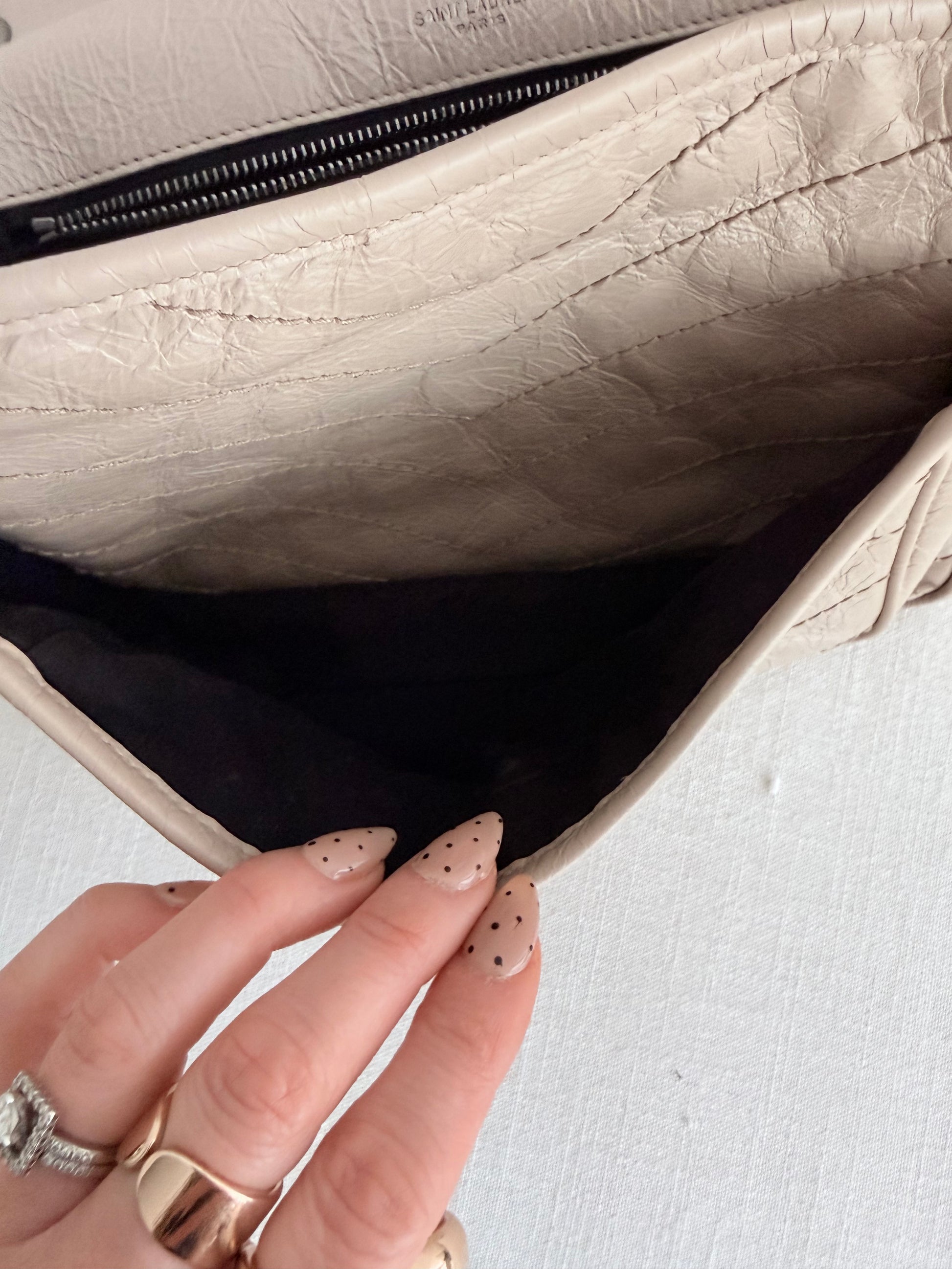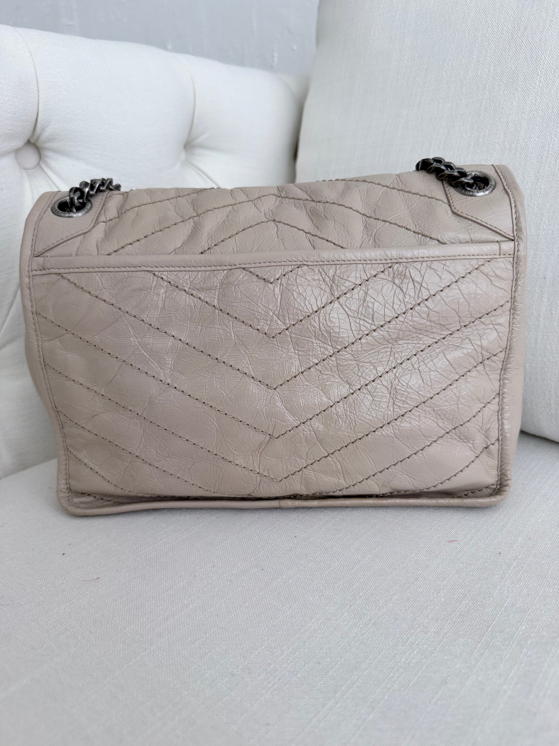 Saint Laurent Niki Shoulder bag in crinkle leather, neutral beige color. Clean interior and exterior. No heavy signs of wear or damage, bottom of bag is clean, corners and edges in great condition. Dustbag and authenticity included. Est retail: $2890